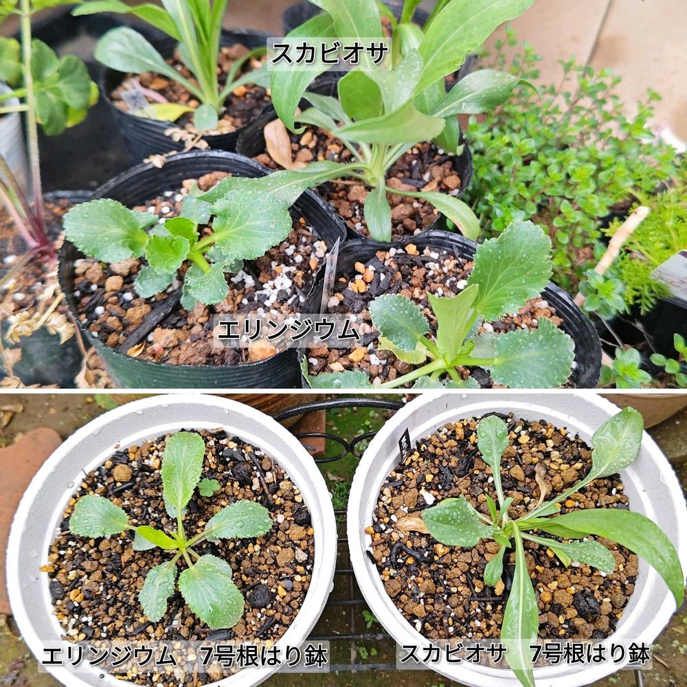 【4枚目】7号根はり鉢のエリンジウムとスカビオサはまだ余裕がありそうですが、これは元々が小さめの苗でしたからね。開花時には根詰まりするかな? どうかな?🤔