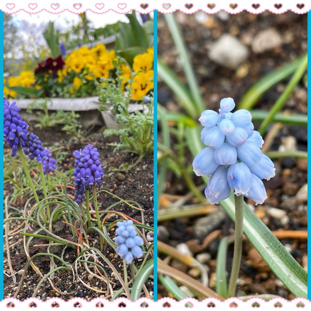 ムスカリは何という名前か忘れました💦💜の中にポツンと🩵増えるといいなあと思ってます♬