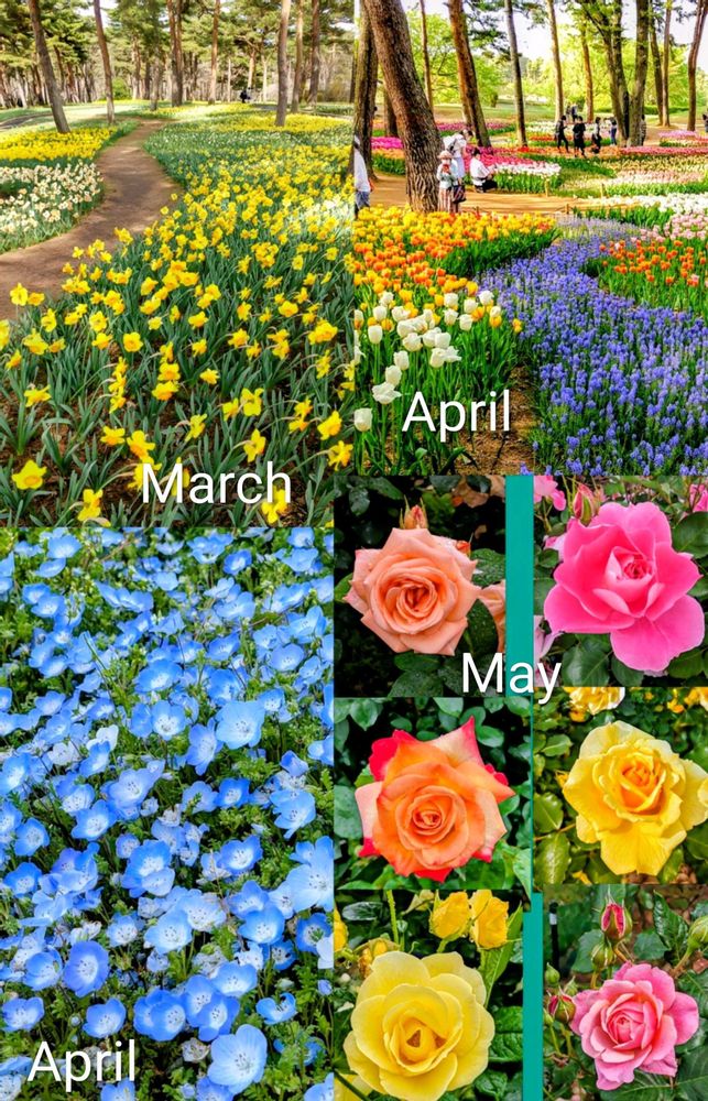 水仙💛からチューリップ🌷にバトンが渡り、ネモフィラ🩵薔薇🌹へと続きます。