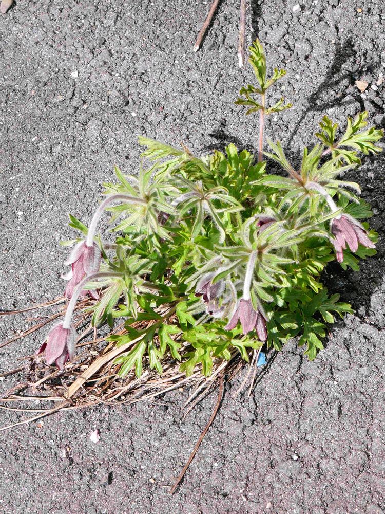 オキナグサはタンポポのように綿毛になるので漂着したところがたまたまアスファルトの割れ目でした。アスファルトは熱を持ちますので結構早春から植物は育ちます。でも種子を飛ばした後の夏の灼熱地獄には耐えられないかもしれません💦