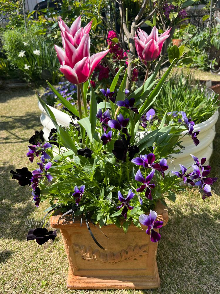 ②絵になるスミレ・パルムとビオラ・アイクールとキングフィッシャーデージーとエレモフィラ➕チューリップ・レディジェーン🌷