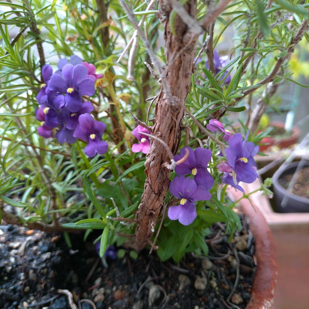 4/1 寄せ植えの植えっぱなしローズマリーの根元でネメシアが咲いています♪