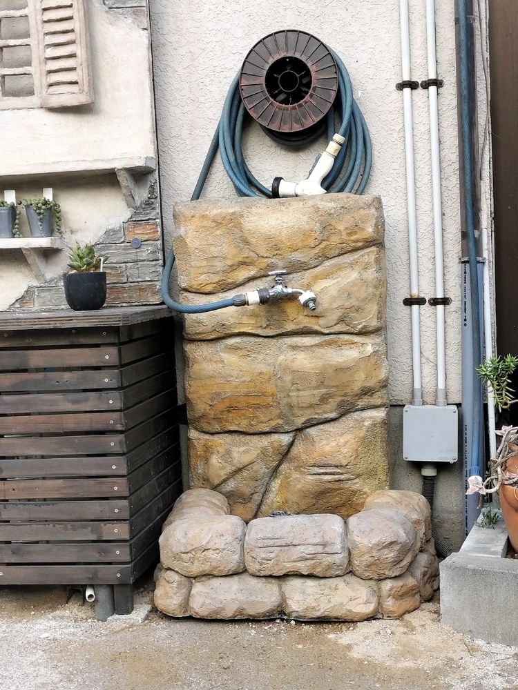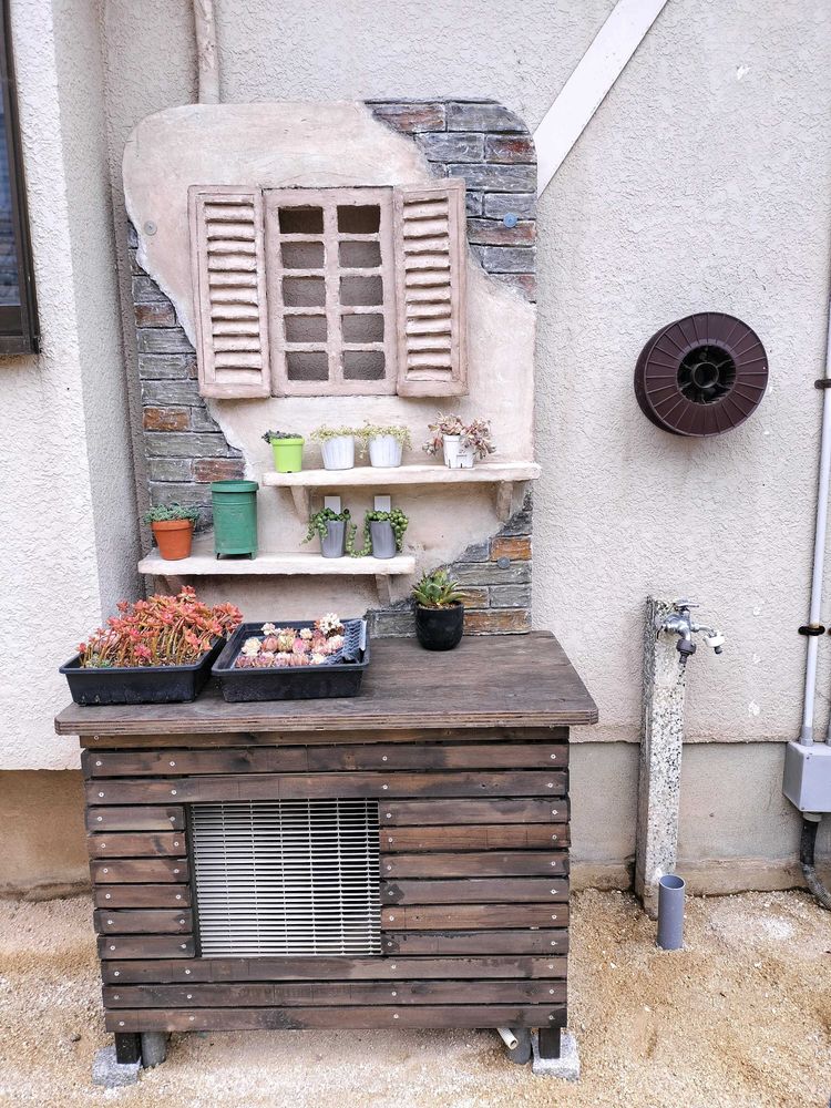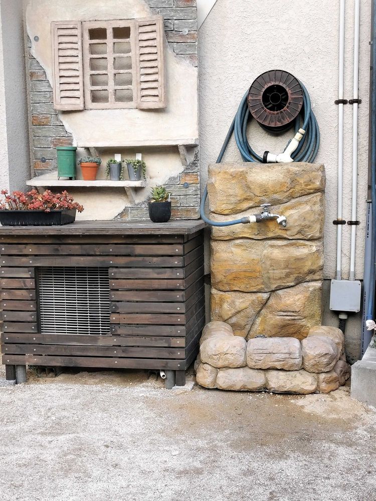 わぁ~室外機カバーご主人の作品!?モルタル壁と素敵にマッチ♥その隣に水道があるんですねぇ〜と思ったら見事に変身〜😋びっくりです!!