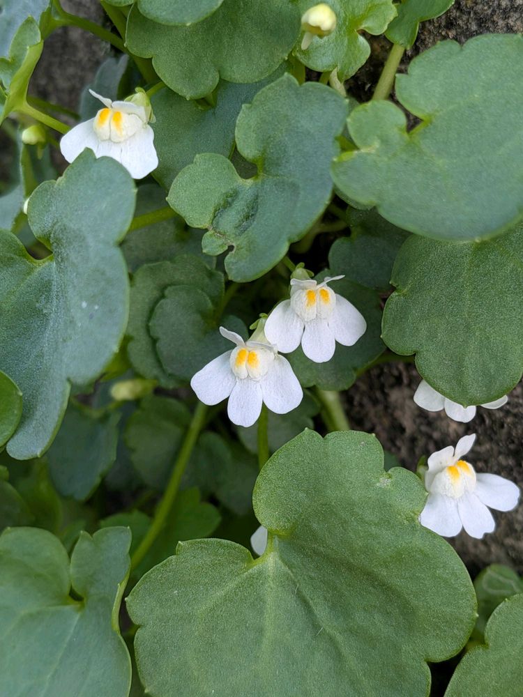 オオバコ科ツタバウンラン属の多年草"蔦葉海蘭(つたばうんらん)"別名"蔦唐草(つたがらくさ)","海蘭葛(うんらんかずら)","キンバラリア","コリセウ厶アイビー"は,一見地味な草ですが,"姫金魚草"を小さくした様な,可憐な花を咲かせます,放置してもよく育つ丈夫な性質の為か,大正時代に鑑賞用として持ち込まれた後,各地で逞しく野生化しました。その為,道端などに咲いているのを見かける事の多い花です。春〜秋と花の時期が長く,夏の盛りにも花を咲かせます。「この恋に気付いて」の花言葉は,その健気な姿に因んで付けられました。