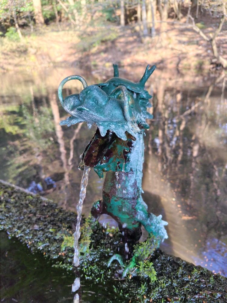 その中の…苔むす石、シダ、ちょっとユーモラスな顔をした龍🐉の手水でした😊