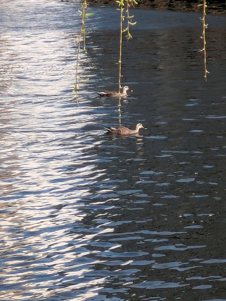 カルガモと柳、水の流れと柳の揺れも感じます✨