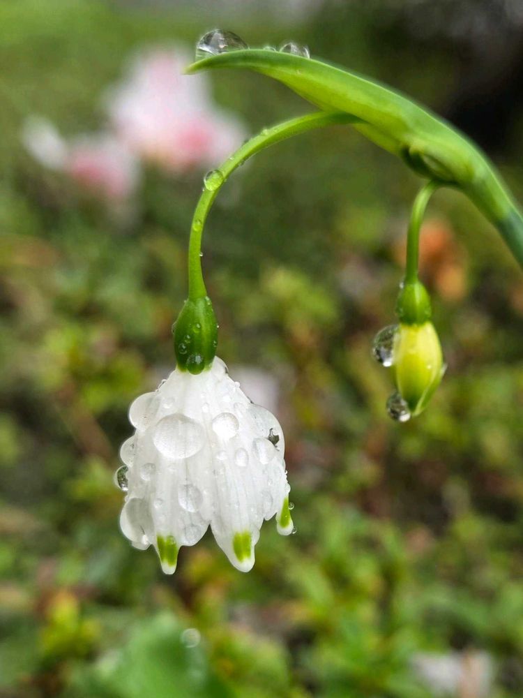 スズランの花に似てますね! 花びら先端に緑の斑点が入り可愛い✨️🎶🫠 3枚目は水滴とのコラボが良い感じです😌💓