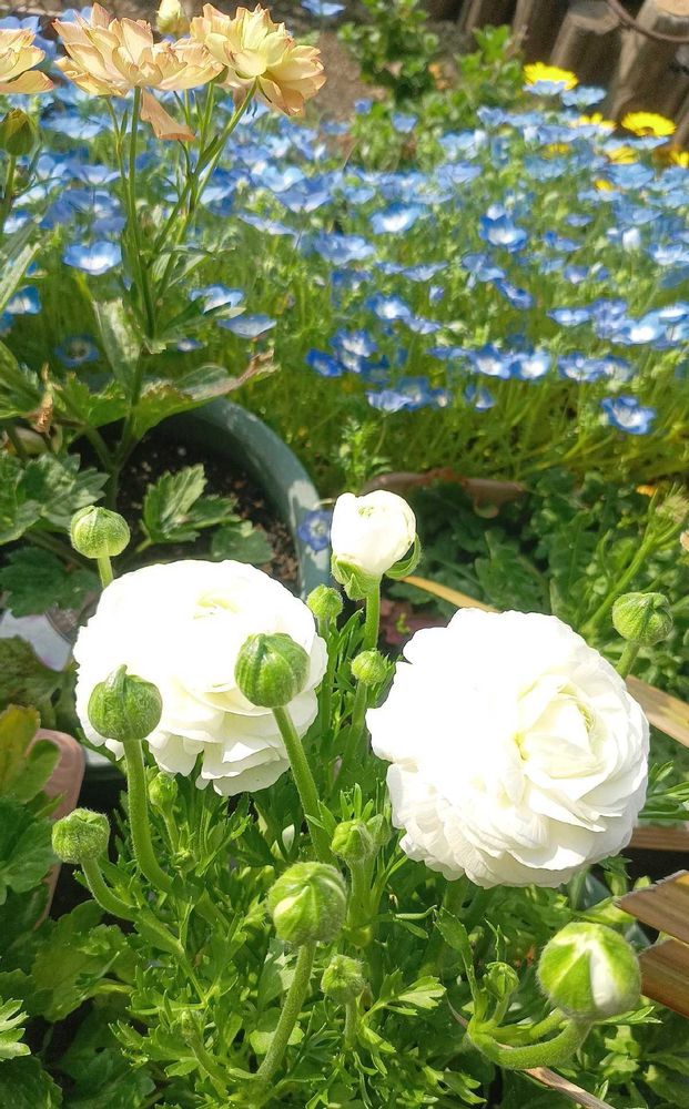 ネモフィラの海を泳ぐラナンキュラスさん🤍🩵