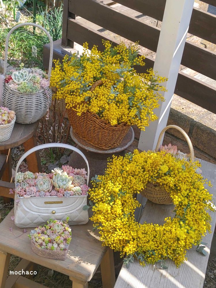①ミモザと多肉