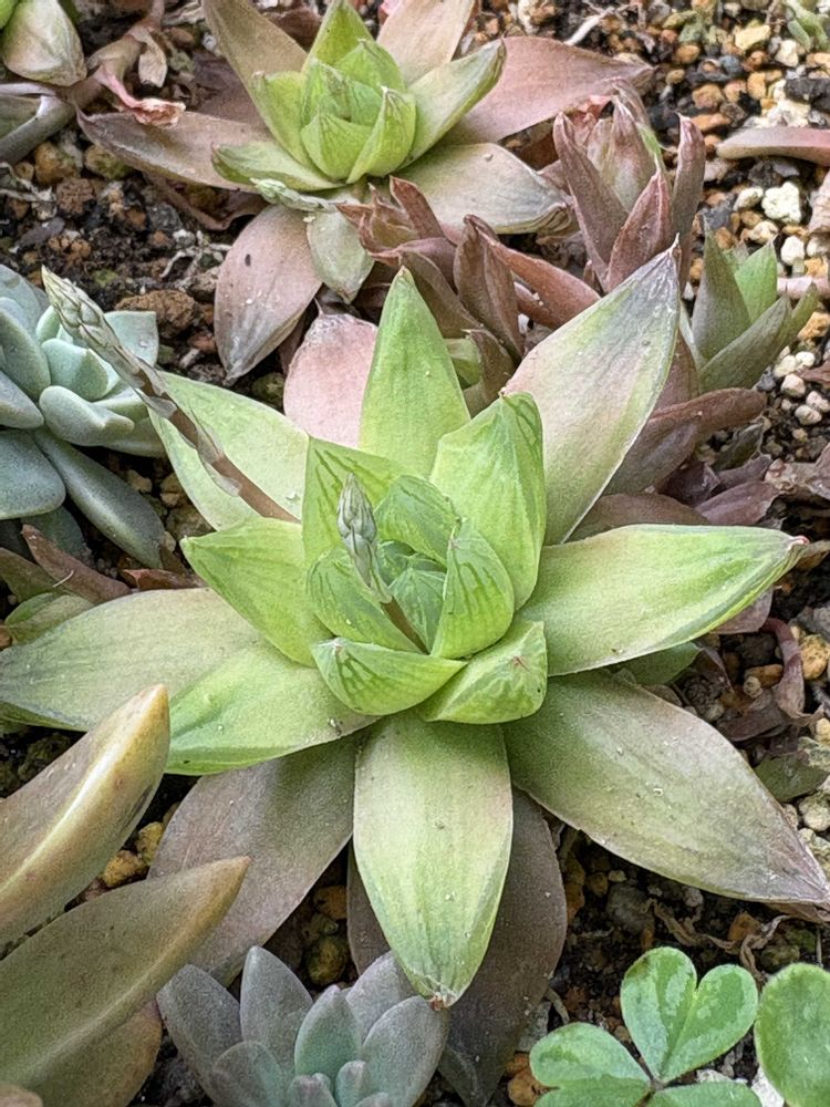 2025年4月にネットでたにたのさんの苗を購入した時におまけでついてきた名無しのエケベリアが面白く育っているので、成長記録を作りました。 この子の名前ご存知でしたら、ぜひ教えてください🙏