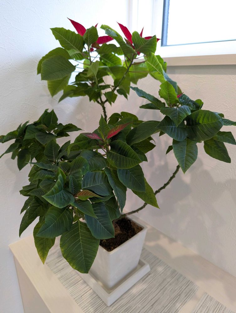 ポインセチアの3年目です。短日処理をしていないので毎年今の時期に少し葉が赤くなります。