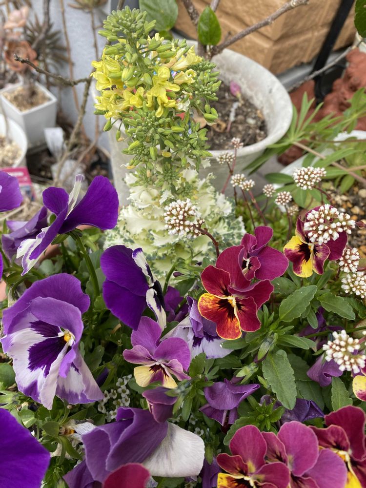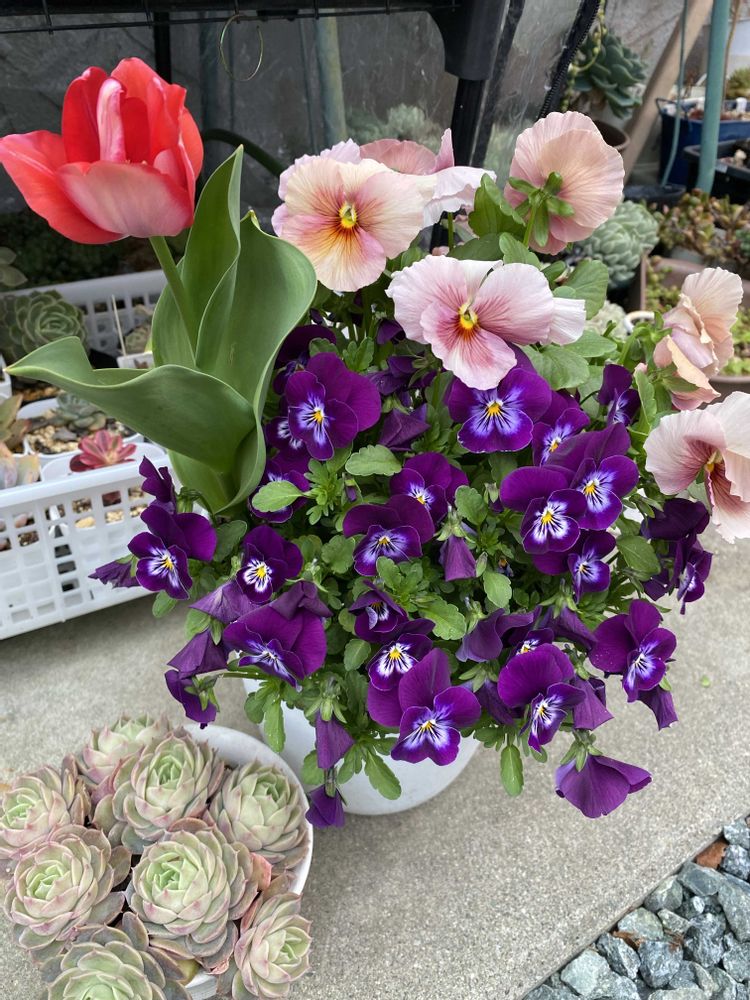 ①ダブルデッカーのパンビオ+チューリップが鉢から溢れています🌷