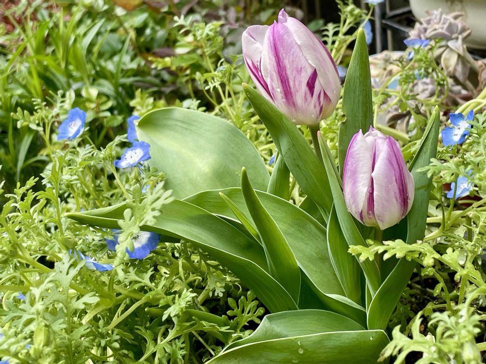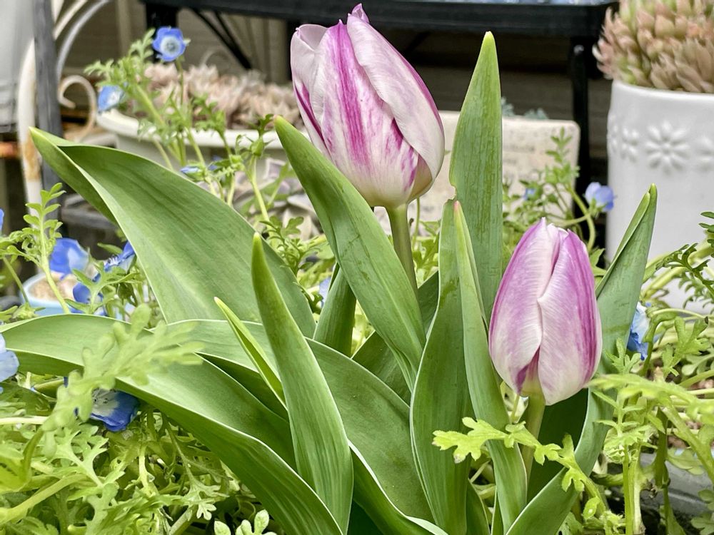 種まきネモフィラと一緒に植えたけど、ネモフィラは先日の春の嵐で暴れ放題💦鉢に枝垂れ咲きのようになっちゃって…この組合せは難アリ?!