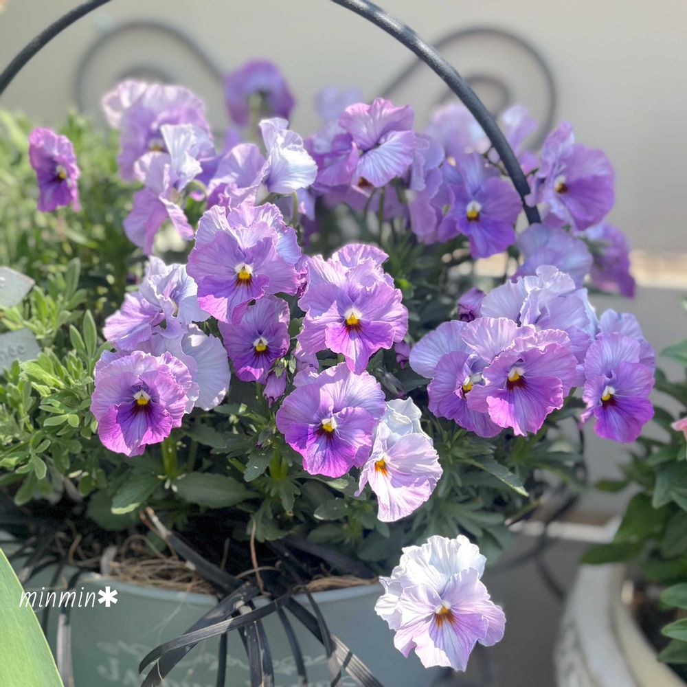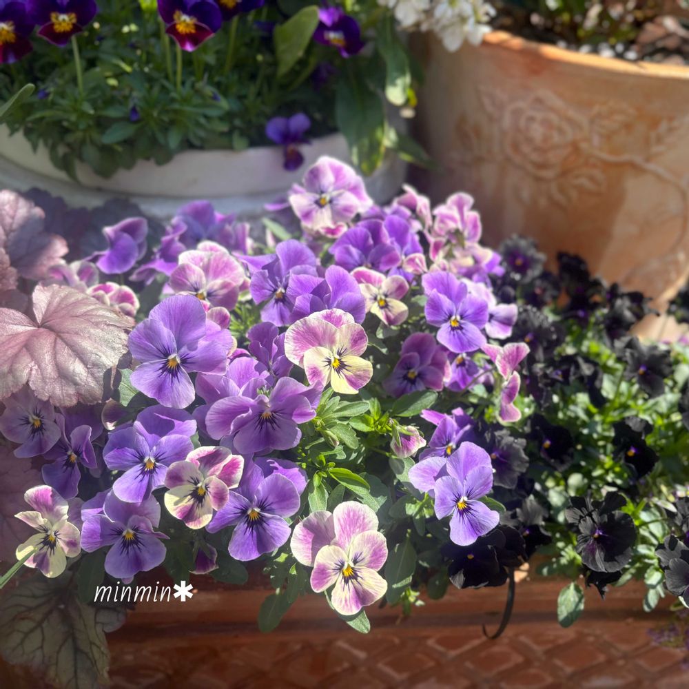 ①秋に作った寄せ植えのウエタミニパンジーのエール17💜モリモリになってきて華やかです💜
