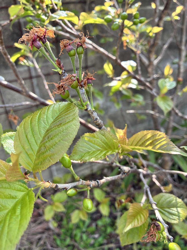 ①庭のさくらんぼ暖地 今年はいっぱい咲いたから、今のところ実もいっぱい付いてる。どうなるかなぁ🍒