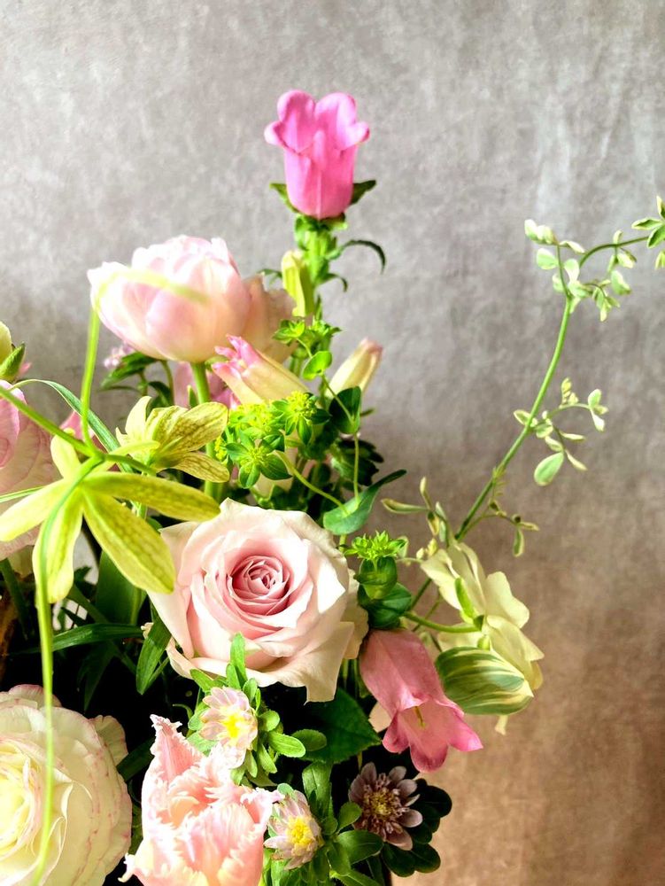 お花やさん《ロジフラワー》が、本人の好きな花々を知っていてくださって、いつもお願いしております。🌹
