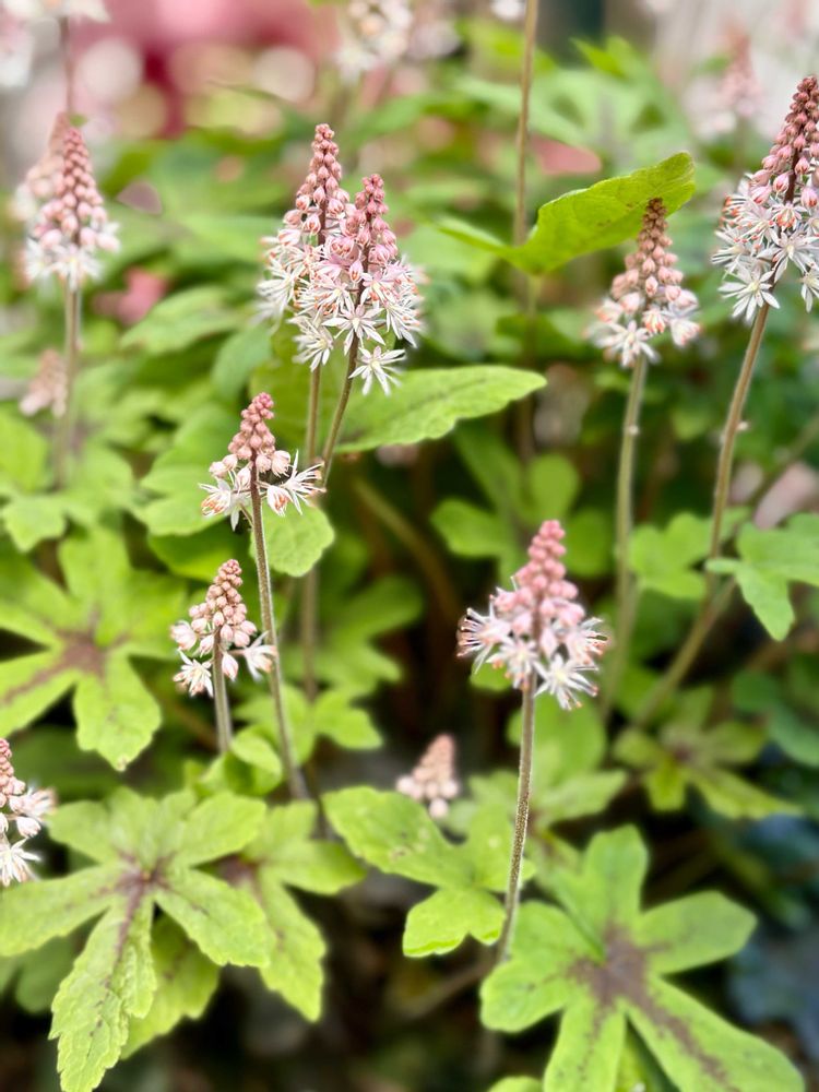 ユキノシタ科の多年草"ティアレア"は,北アメリカ原産で,大きく裂けたユニークな葉の間から花茎を立ち上げ,小さな白い花穂を付けます。庭植え,花壇,鉢植えに向くので人気があります。日陰地で,腐植質に富んでやや湿った,水捌けのよい所に,鉢植えの場合は,鹿沼土をべースに水捌けよく植えるとよいです。