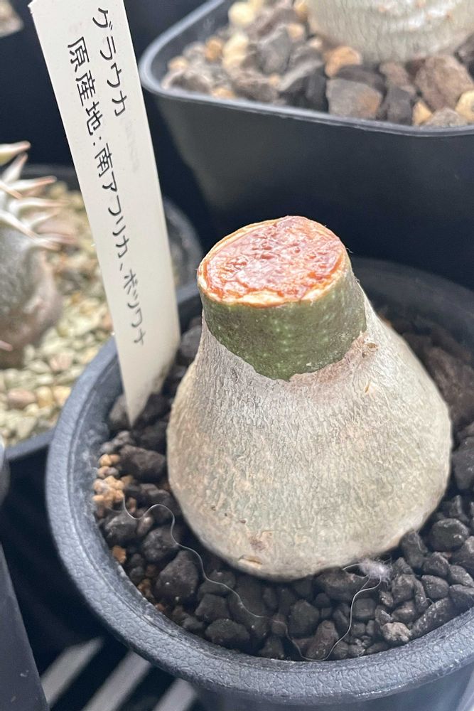 叔母にプレゼントしたのは、塊根の直径10cm程、高さ10cm程、上に出ている枝は多数でびっしり、長さは5cm〜7cmくらいあったよ。