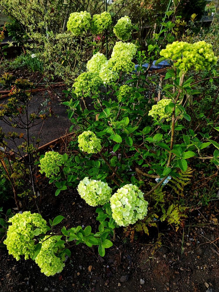 二期咲きのビバーナム ステリーレ、お花がだんだん白くなってきました。庭のちょうど真ん中にあるので、我ながらいいところに植えたな…と色んなところから見てニマニマしております。