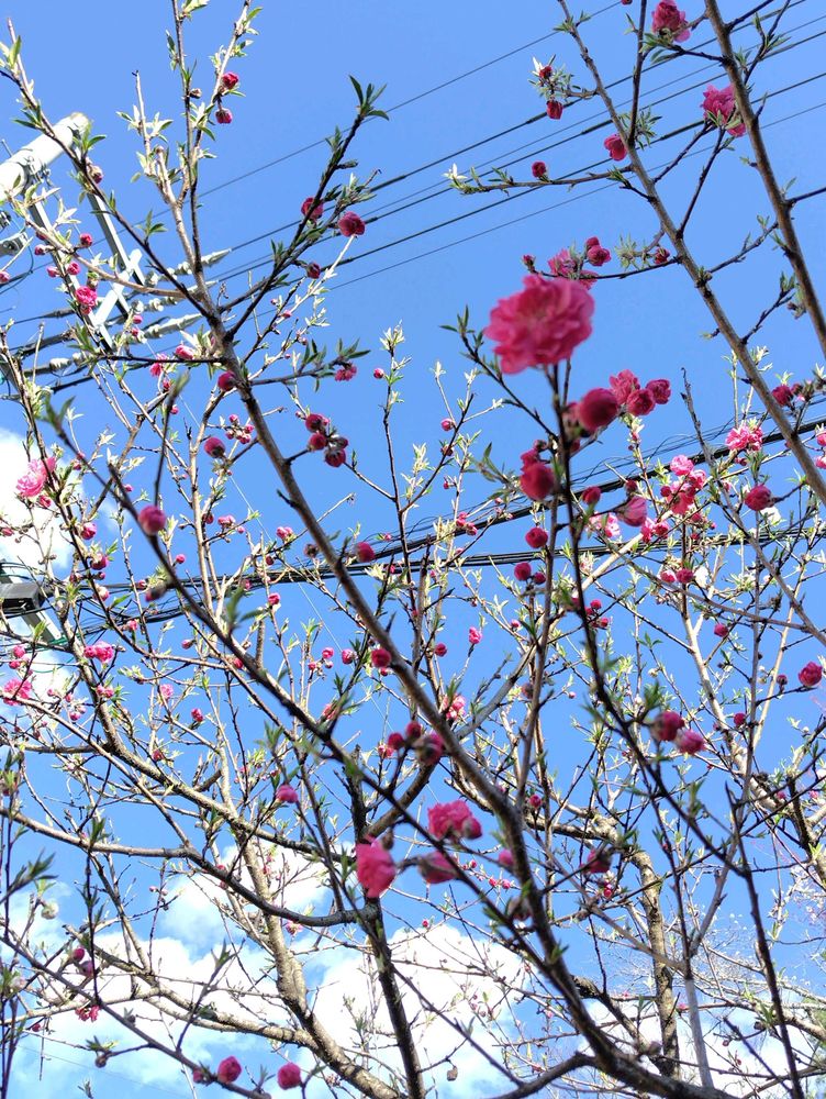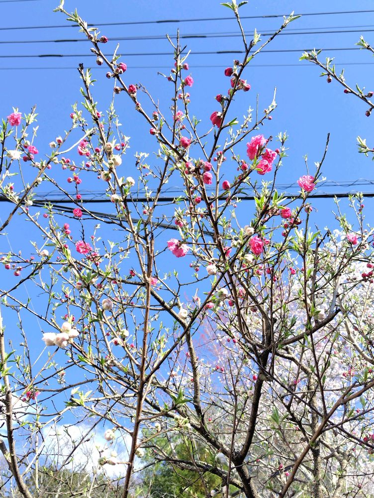 ①一番早く咲き始めたピンク色の枝垂れ花桃です🌸🌸🌸