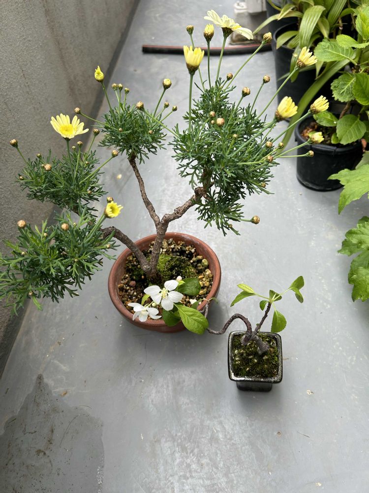 マーガレットソレミオと手前は今日四天王寺のわつかいちで、見つけたミヤマカイドウ、