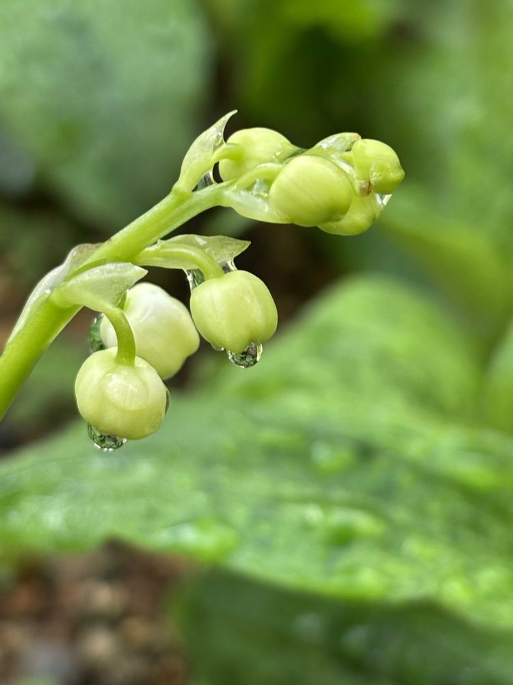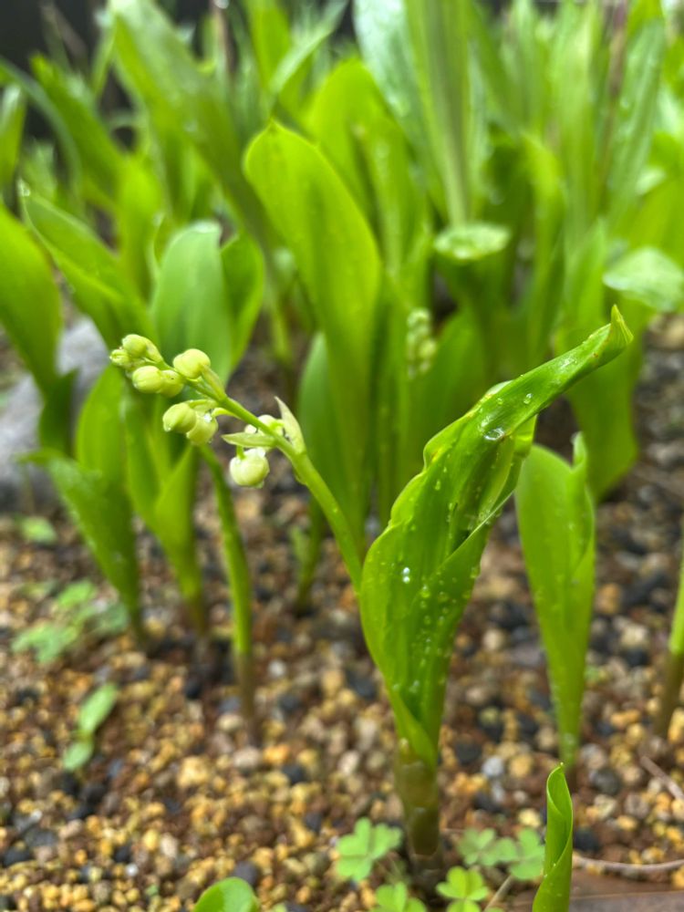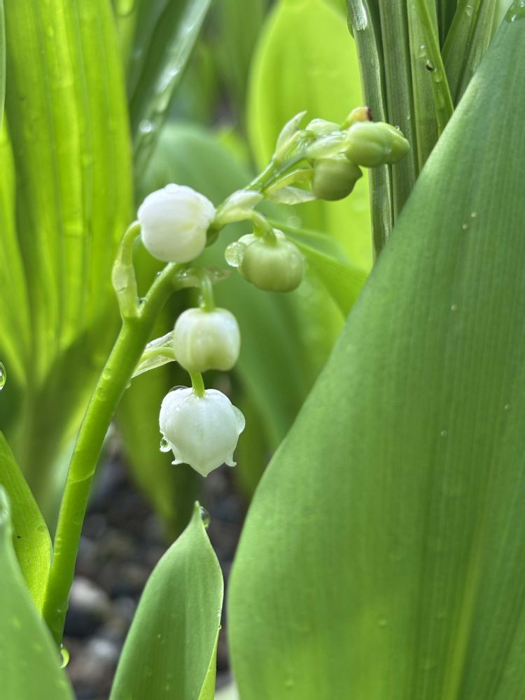 今朝、雨上がりの庭に出てみたら、鈴蘭(スズラン)が雨粒をまとって咲いていました。