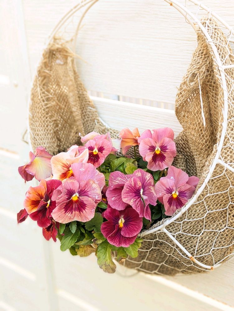 今年はハンギングバスケットを初めて買って、くすみカラーのパンジーを入れてみました