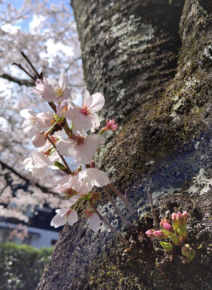 ③年代物の太い幹から芽吹いた蕾と花が逞しい