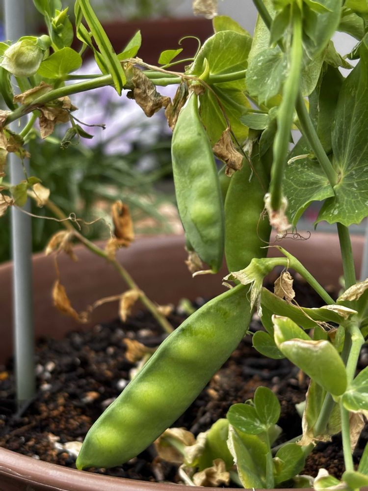 身長が全然伸びないサヤエンドウ🫛背が小さいわたしに気兼ねしなくていいのにね😅15センチくらい伸びたところで花が咲き、実ができちゃいました💦今日の収穫たったひとつ✌️