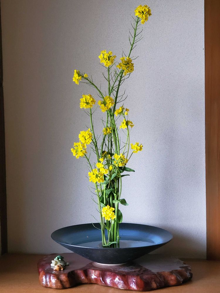 飼い犬を畑で遊ばせていた所、放置していたチンゲン菜の成れ果て(120cm越え)菜の花を根ごと引っこ抜き…。捨ておくのも勿体ないので水盤に立ててみた