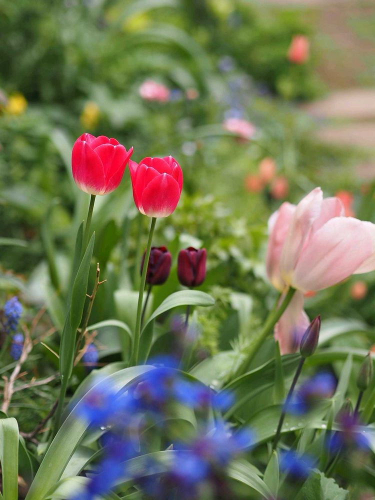 春の庭も前半のピークに。あまり考えずいろいろ取り混ぜて球根を植えていたチューリップですが、咲いてみたらなかなかいい感じです。