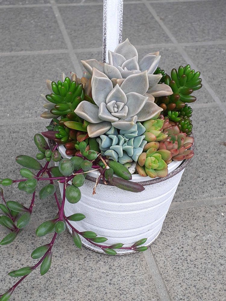 多肉の普及種でつる下げポットに寄せ植えしました。