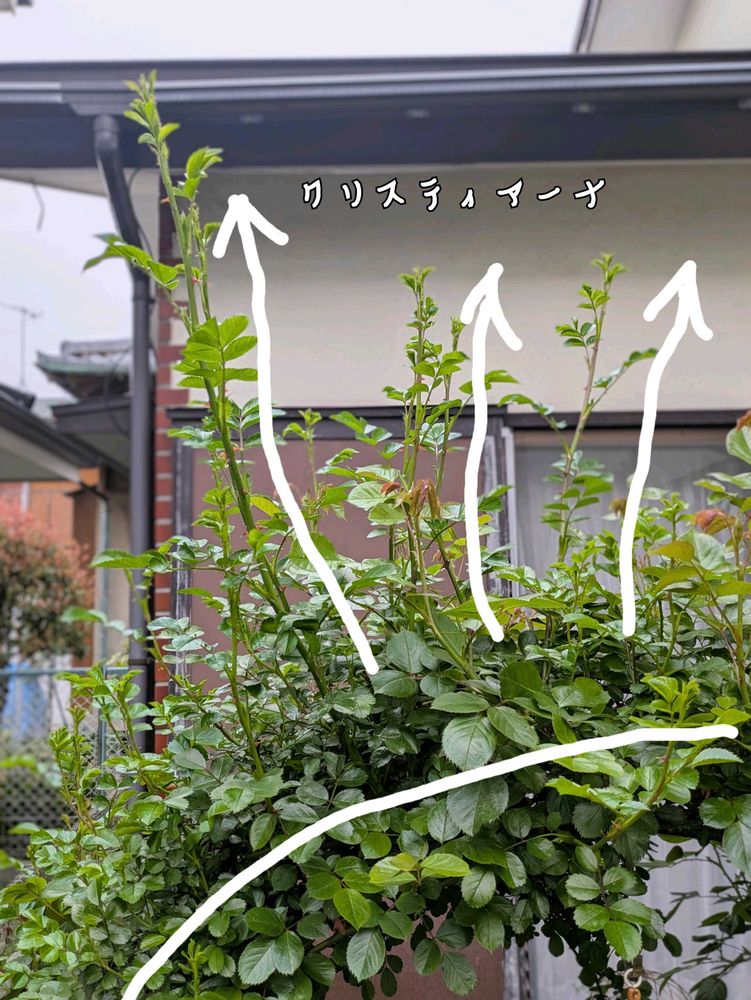 今まで他のつるバラは同じくらいの丈で均等に伸びるので全体的にワサワサして特に気にしたことなかったのですがクリスティアーナは数本だけが勢いよくて間がスカスカ。しかもクリスティアーナってステムが太くて横に寝かせるのも難しそう。