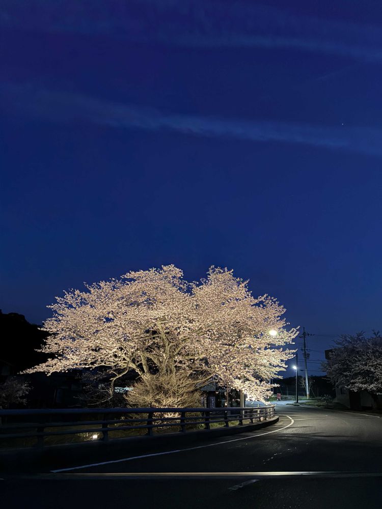 カーブ沿いの桜は夜に見るとまるで白い幽霊が並んでいるようにも見えます