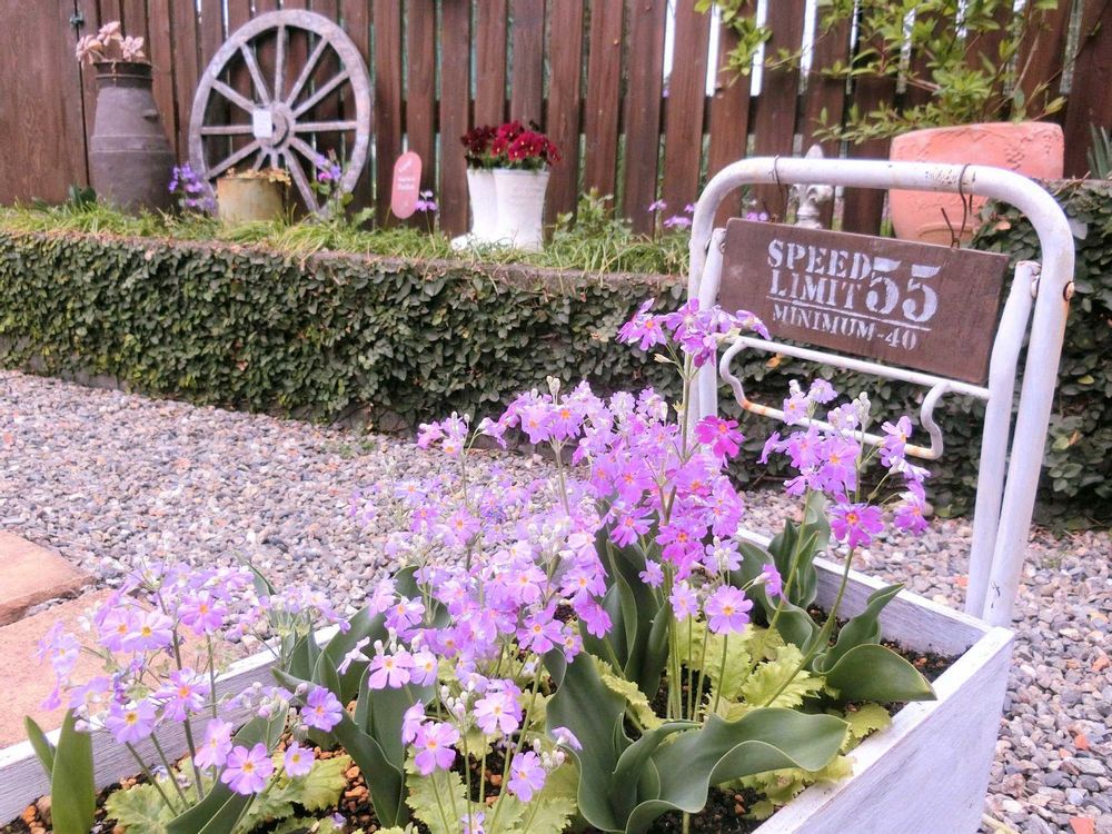 ①② 花車にチューリップと一緒に植えたサクラソウ🌸🌸🌸