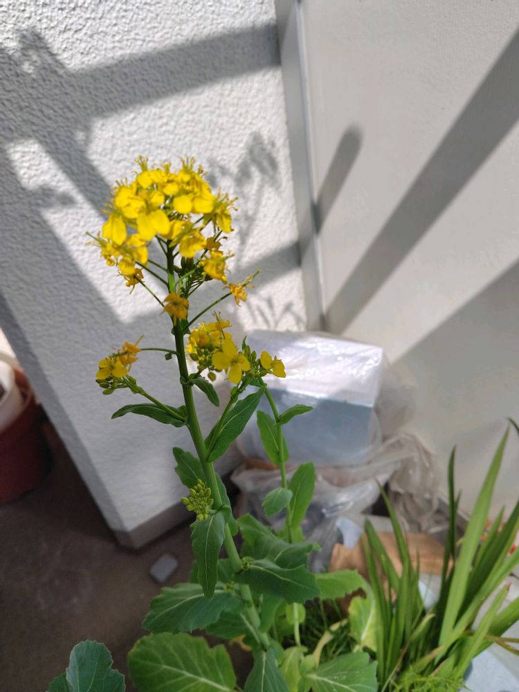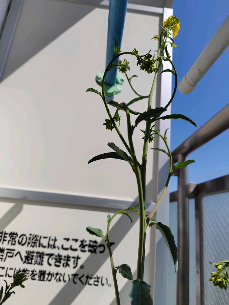 2pic目のからし菜はぐんぐん伸びて、ベランダの手すりを越えて気持ちよさそうに咲いてます。