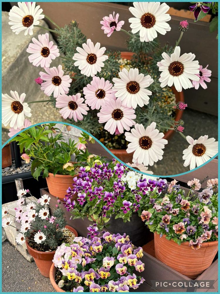 冬にセット苗でお迎えして葉っぱ🌱はすぐに枯れていき、大丈夫かぁ?と思いながら観察していると3月も半ば過ぎになって葉っぱ🌱が復活してきました。ここへきてようやく花🤍🩷💜が咲き始めました😅💦