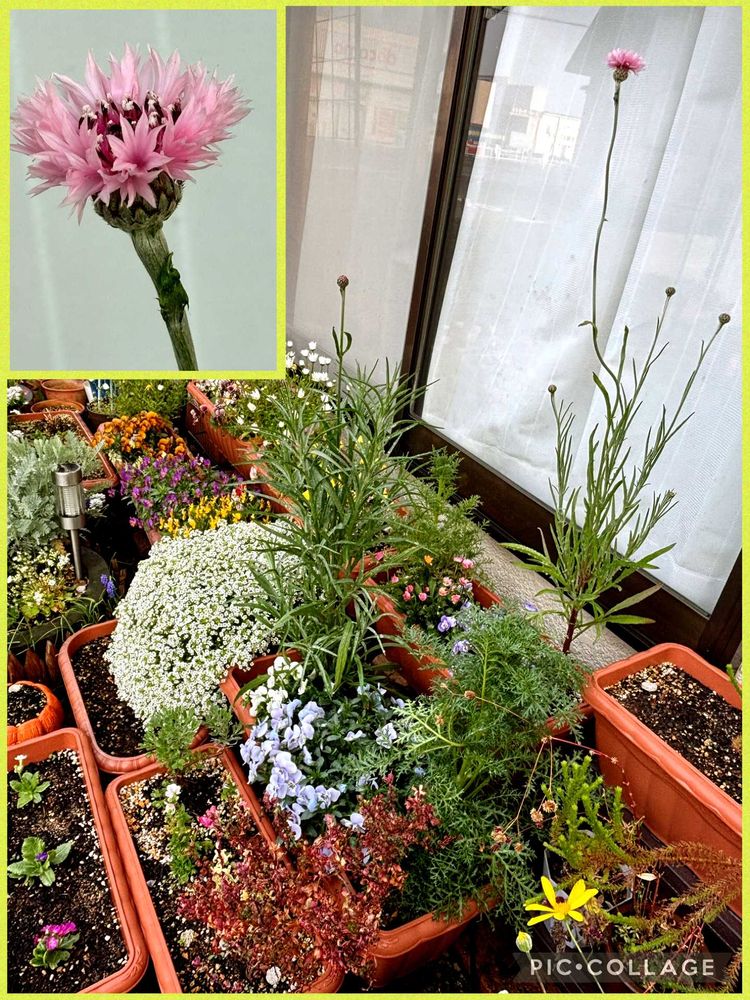 1つは『矢車草』🩷、近くでモリモリのグリーン💚は『ギリア レプタンサ』💜