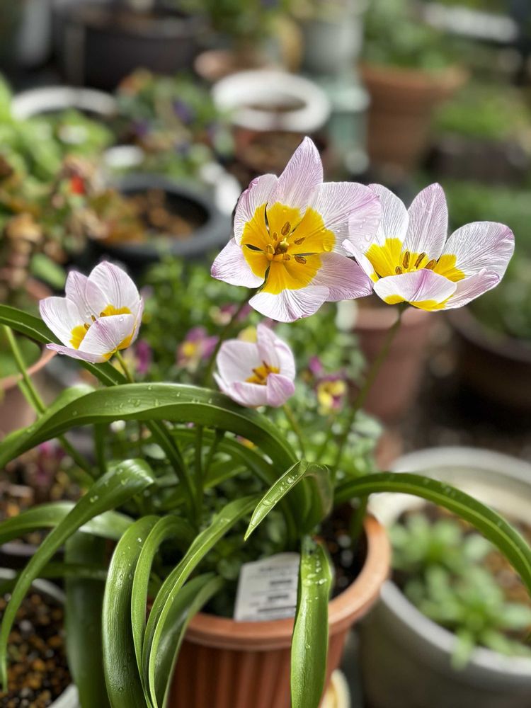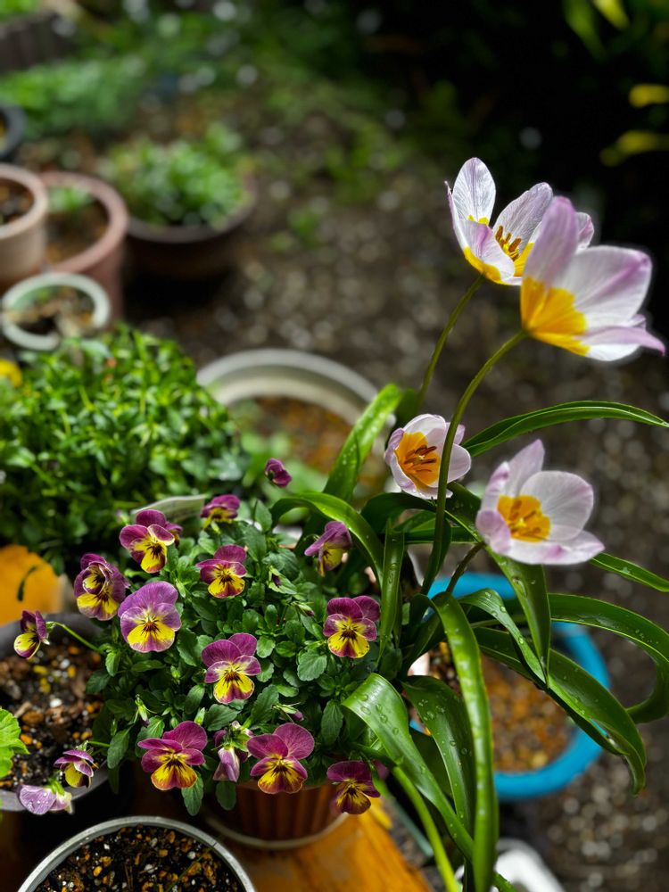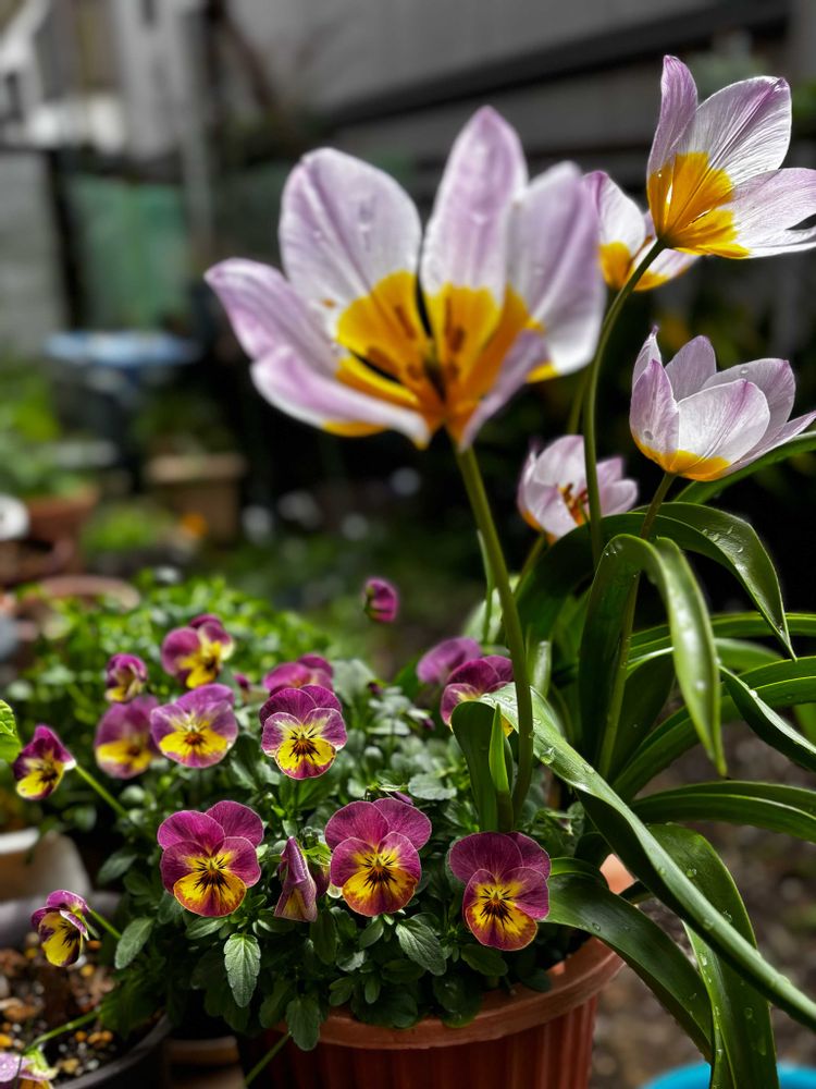 ①②③④暖かくなり、チューリップがグンと伸びて10月末に一緒に植えたビオラと咲きそろいました🌸