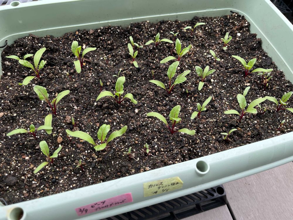 先週の間引き・土寄せを経て、本葉が見えてきました。弱々しかった芽も安定してきたようです😌