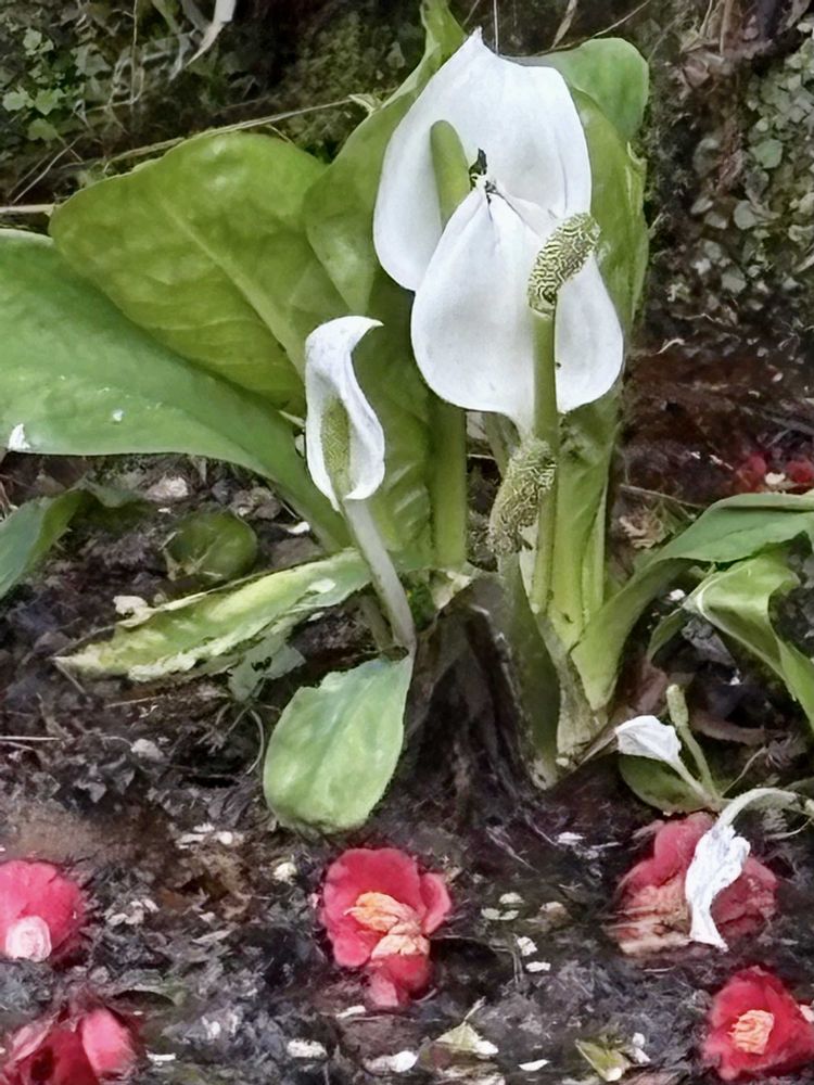 ミンちゃん花パト行ける所に咲いてるの良いなぁ〜ミズバショウと落ちた椿のコラボも素敵デス