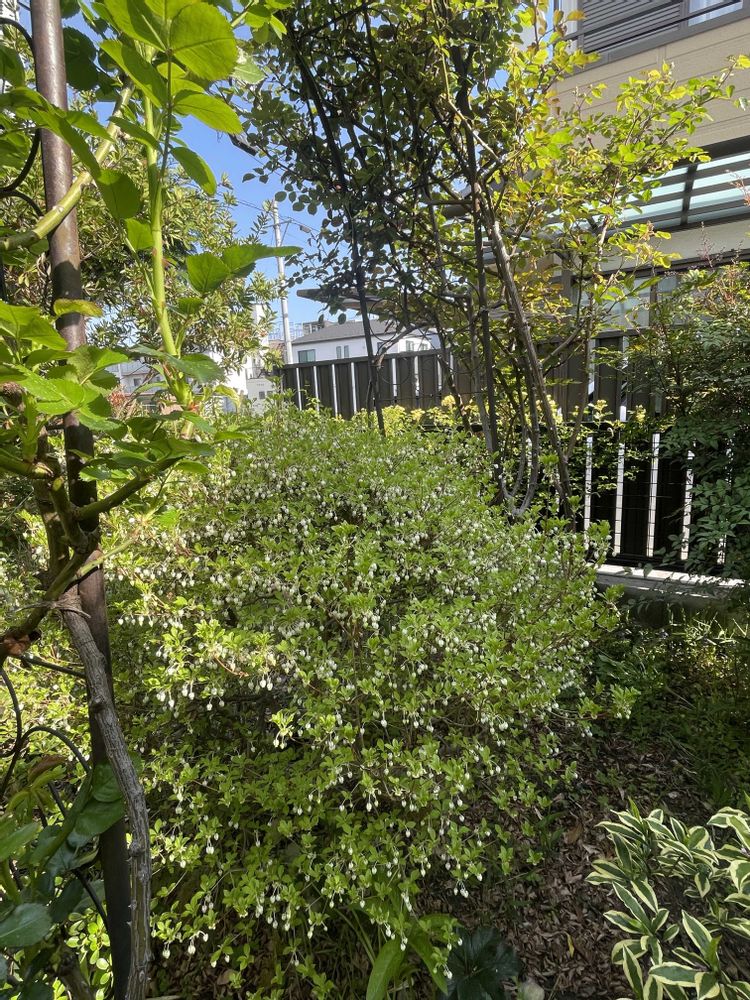 最後はバラのアーチ ドウダンツツジ の向こうに咲く モッコウバラです