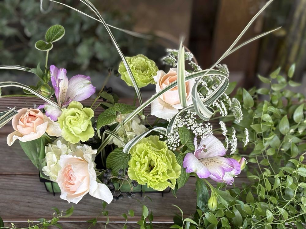 花材=バラ、トルコキキョウ、レースフラワー、ムシカリ(枝)、ヘデラ(実)、アジサイ、アルストロメリア、ミスカンサス