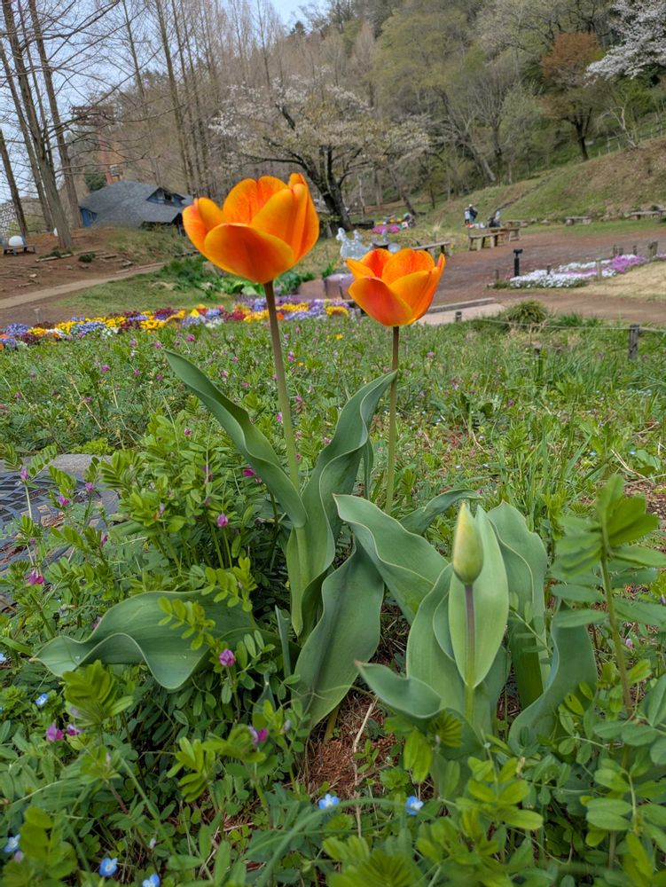 昨日は良い天気の下長めの散歩🚶 あけぼの子どもの森公園へ行くと「チューリップ」がポツンと🎵