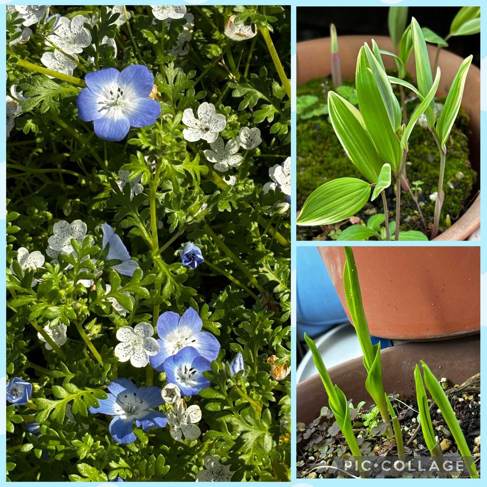 左はあまりにかわいいので💕種まきっ子ネモフィラとお迎えしたネモフィラさん💕入り混じるように咲いてかわいい💕
