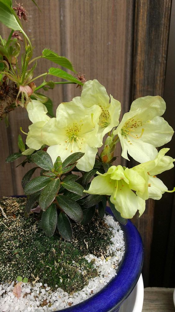 葉桜の盆栽、添えの黄花石楠花、咲きました。