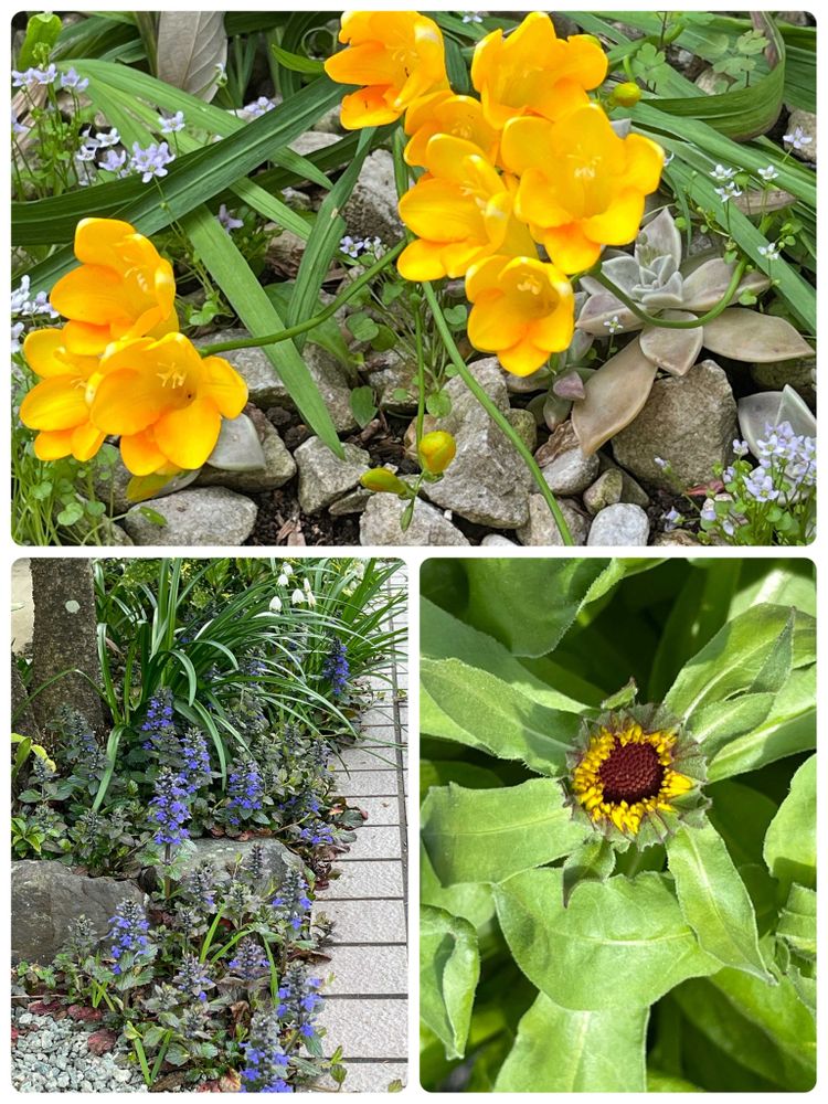 ②黄色いフリージアが咲いてきました。アジュガも咲き出しました。