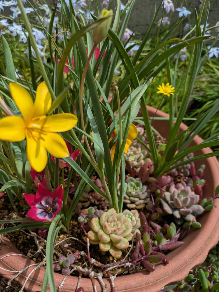2年前に植えた放ったらかしの鉢に変わったチューリップアソートとと多肉のコラボが今春も心を癒すアイテムでかわゆいです。お試しあれ