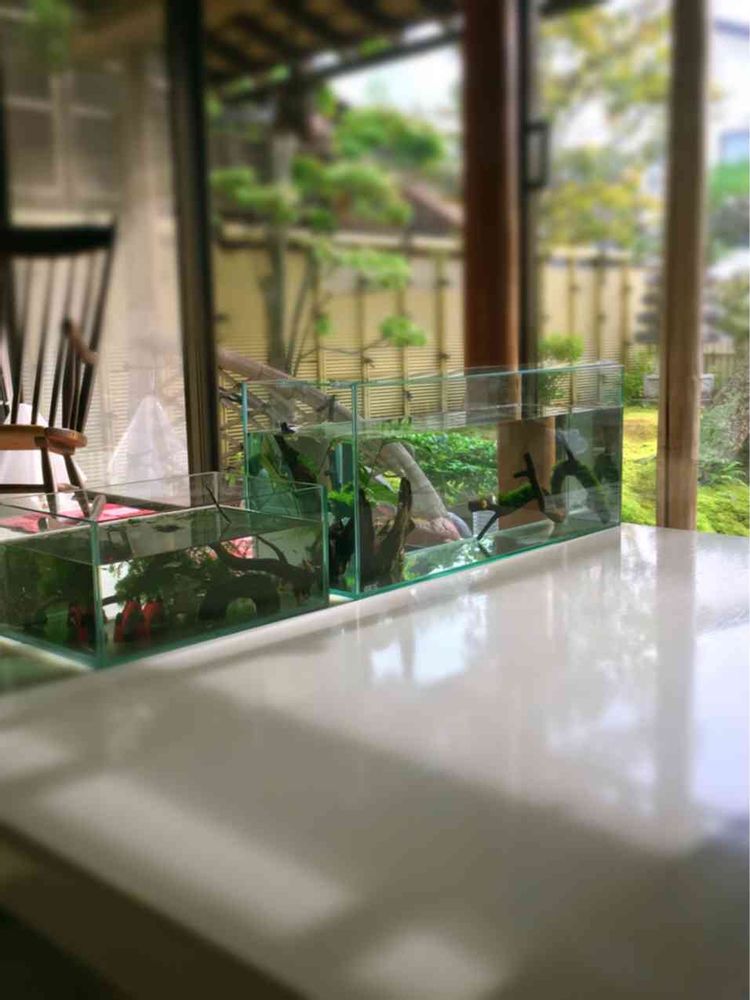 魚も大好きで山奥自宅にUターンする前は縦に長く高さのあるガラス花瓶を水槽にしてブラックタイガーを水草と一緒に育てていました。椿さんのお庭も水槽もシンプルだけどとってもクオリティ高くてホントに美しいです🎵