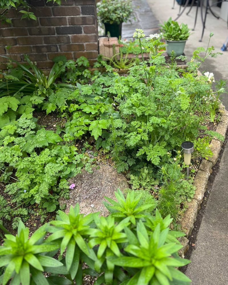 ④小さな花壇は、トワさんからのスカシユリを地植えにしました。オルレア、カモミール、ニゲラの共演!